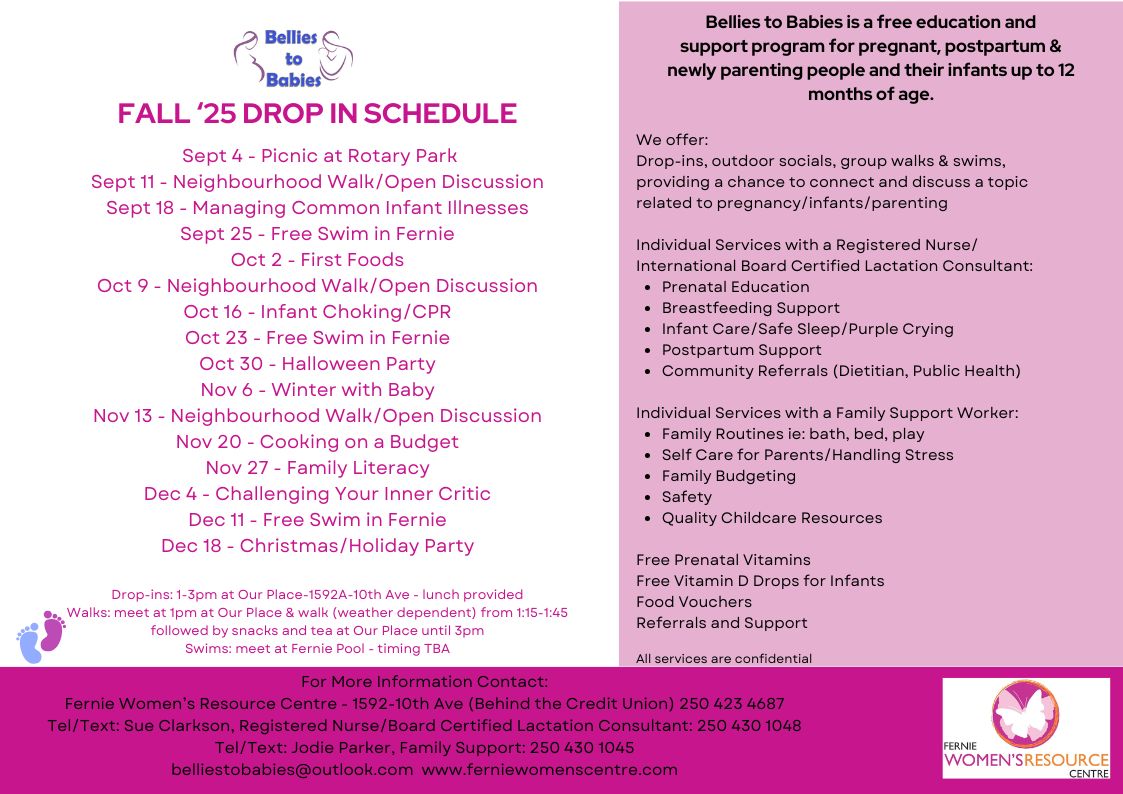 You can join the program by filling out the Welcome Card using the button below, or by calling or texting 250-430-1045 or 250-430-1048. You can also emailĀ belliestobabies@outlook.com. Check out the Fall Drop In Schedule here.